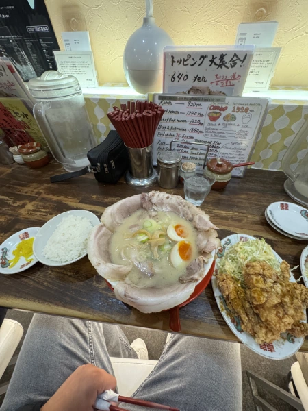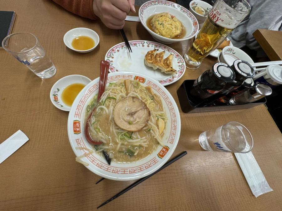 The set included rice, meat, an omelet on top, gyoza on the side, and some bacon-like items. It wasn’t fancy, but it felt real like eating as part of everyday local life rather than as a tourist.